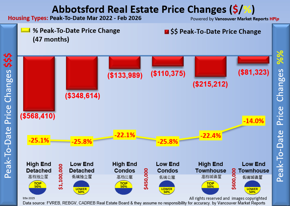 Sales remained slow due to affordability challenges, economic uncertainty, and high inventory, keeping buyers firmly in control. While conditions are still soft, the smaller price adjustment suggests the market may be starting to stabilize compared to late fall. Bottom line: prices are correcting at a slower rate, buyers still have leverage, and the Fraser Valley is holding up better than Metro Vancouver.