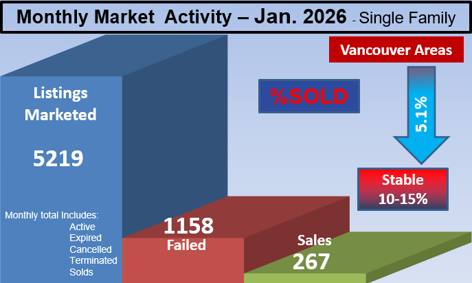 Current:  Vancouver area Real Estate Market is in Buyer's with an average of 6.3% SOLD rate.   See each city for the full details.