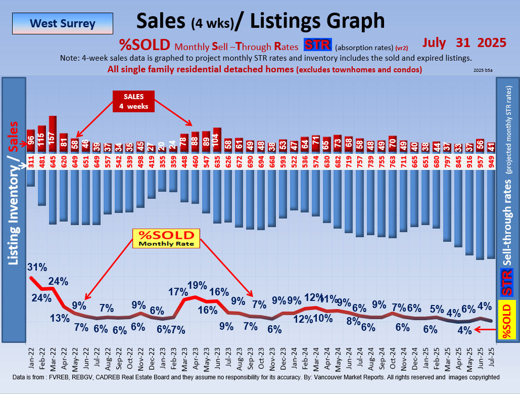 Current: West Surrey is in a Buyer's Market with an average listing inventory, 4 %SOLD rate and a 95% Sell/List Ratio.