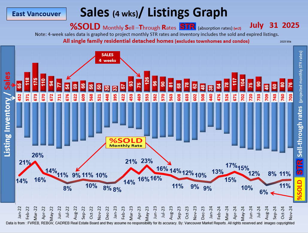 Current: East Vancouver has a Buyer Market with average listing inventory, 7 %SOLD rate, a 96% Sell/List Ratio and 19 DOM.